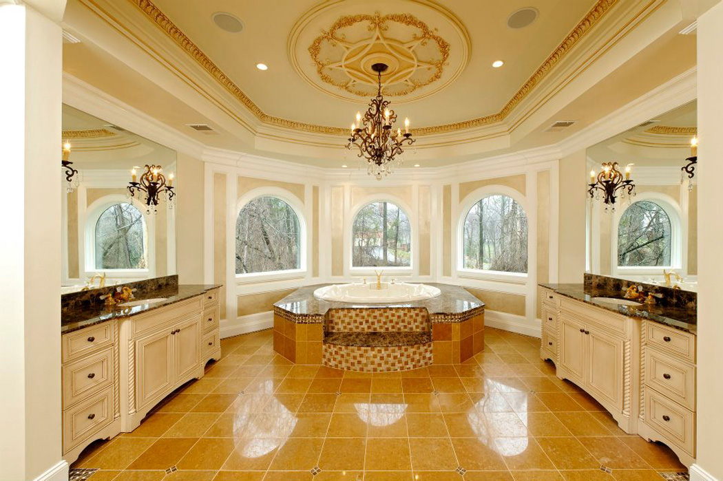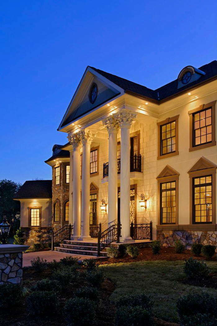 As a grand stucco and stone colonial, this home stretches before us as we approach the grand columned entry. The stucco façade provides a level of detail and variety to welcome the eyes, and is accented by copper dormers and stone columns.