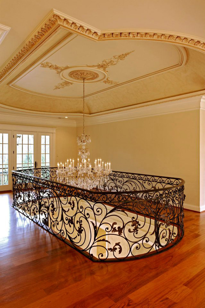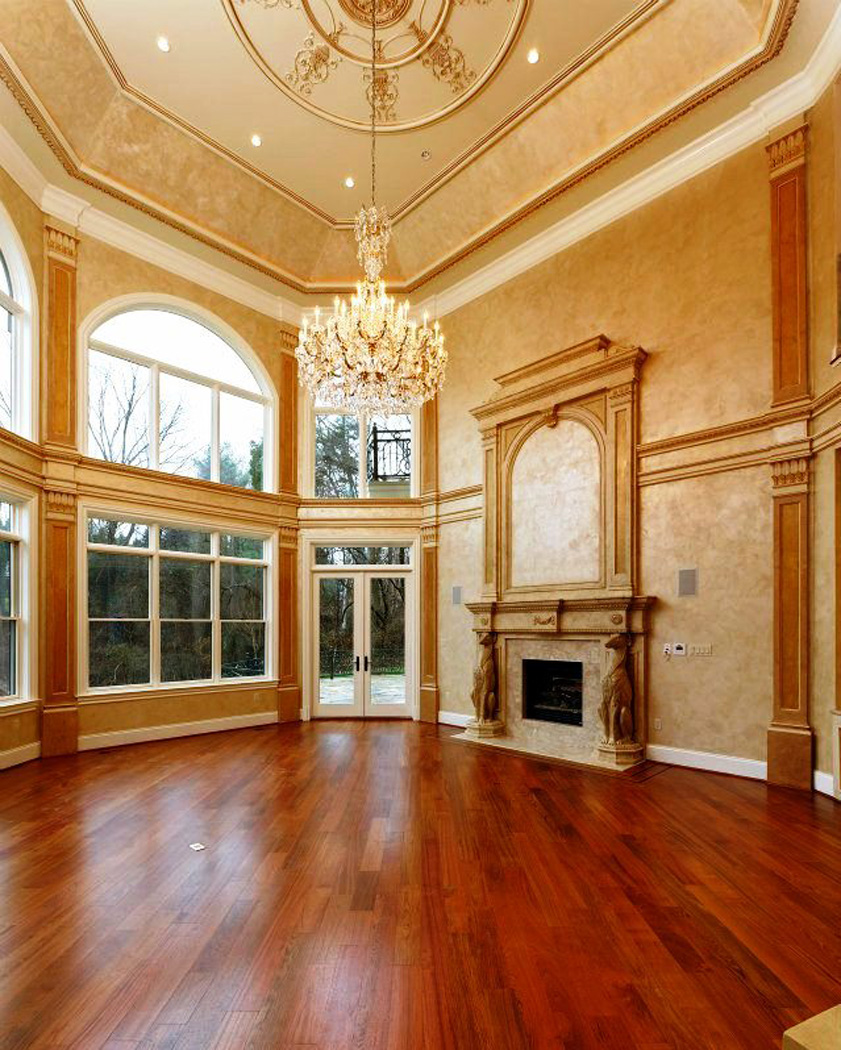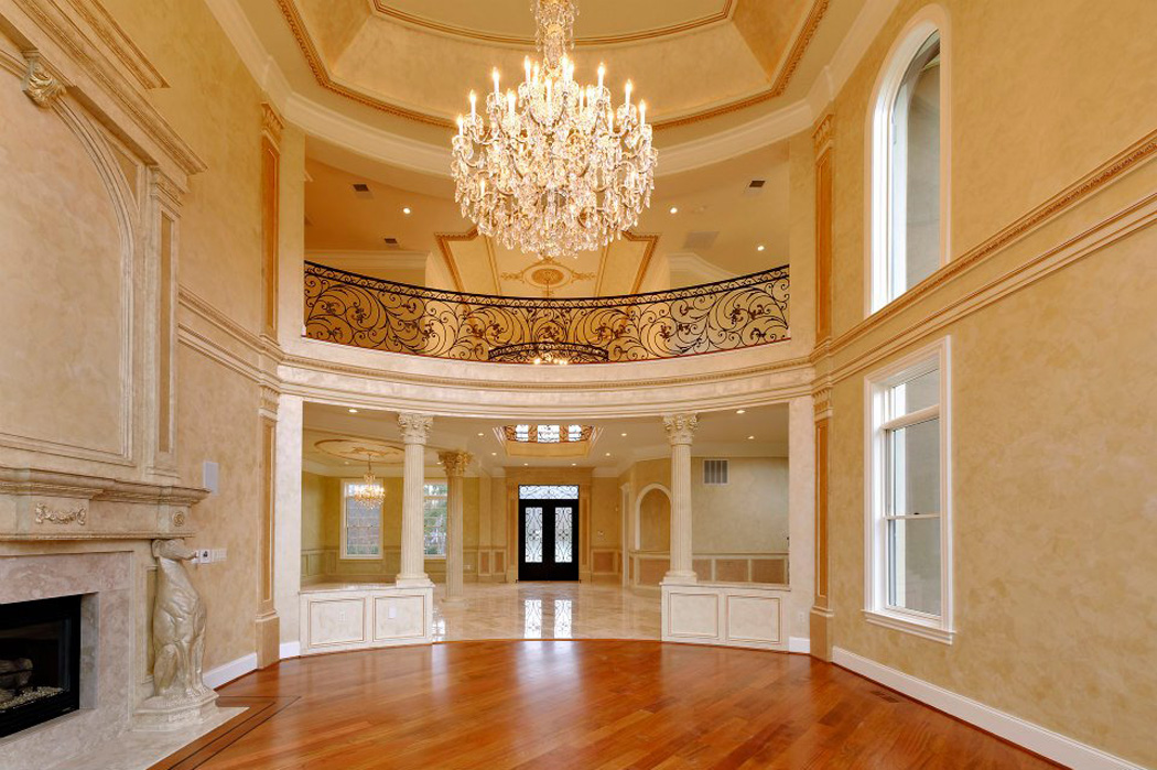 The second you enter the home, your eye see’s the grand living room and the curved stair tower at the rear, complete with curved treads. Custom paintwork and warmly stained floors provide a background for the plaster trim detailing and custom stone mantels. Large open spaces are all designed to allow maximum light and comfortable livability.